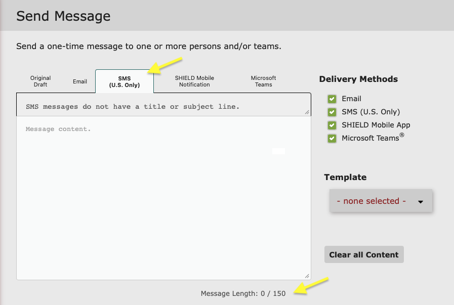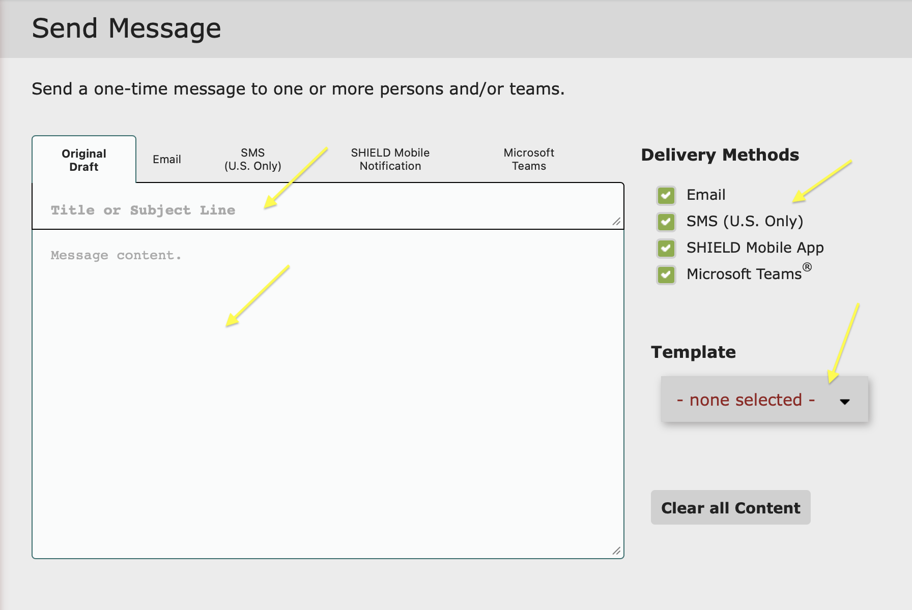 Select from a preset template or draft the message you want to send your people then choose the delivery method(s) you would like to use to send the message: Email, SMS, SHIELD iOS App or Microsoft Teams*.