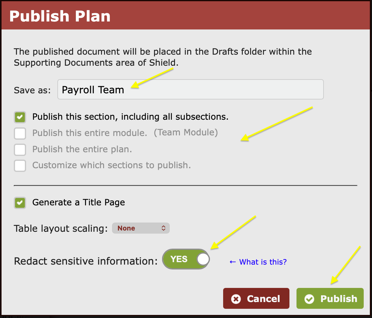 - Give the document you are about to publish a name (in this example, we called it Payroll Team) and choose from the publish option “Publish this section… entire module...", etc. In addition, click the red ‘No’ beside “Redact sensitive information:” so that it changes to a green ‘Yes’. This will ensure the following: